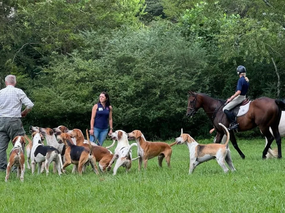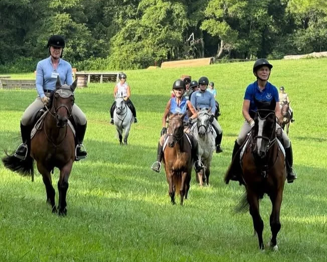 Fox Hunting Camp 2025 was an outstanding success, thanks to the incredible volunteers who helped make the day both educational and fun for the 29 participants (9 were members and 20 prospective members and guests.) Riders of all abilities were divided into groups, including Green Horses and Riders, Second Flight Riders, Cross-Country Jumping Riders, and Junior Riders. Throughout the day, they learned essential fox hunting skills on horseback, from crossing creeks and ditches to opening gates and riding quietly in a group.